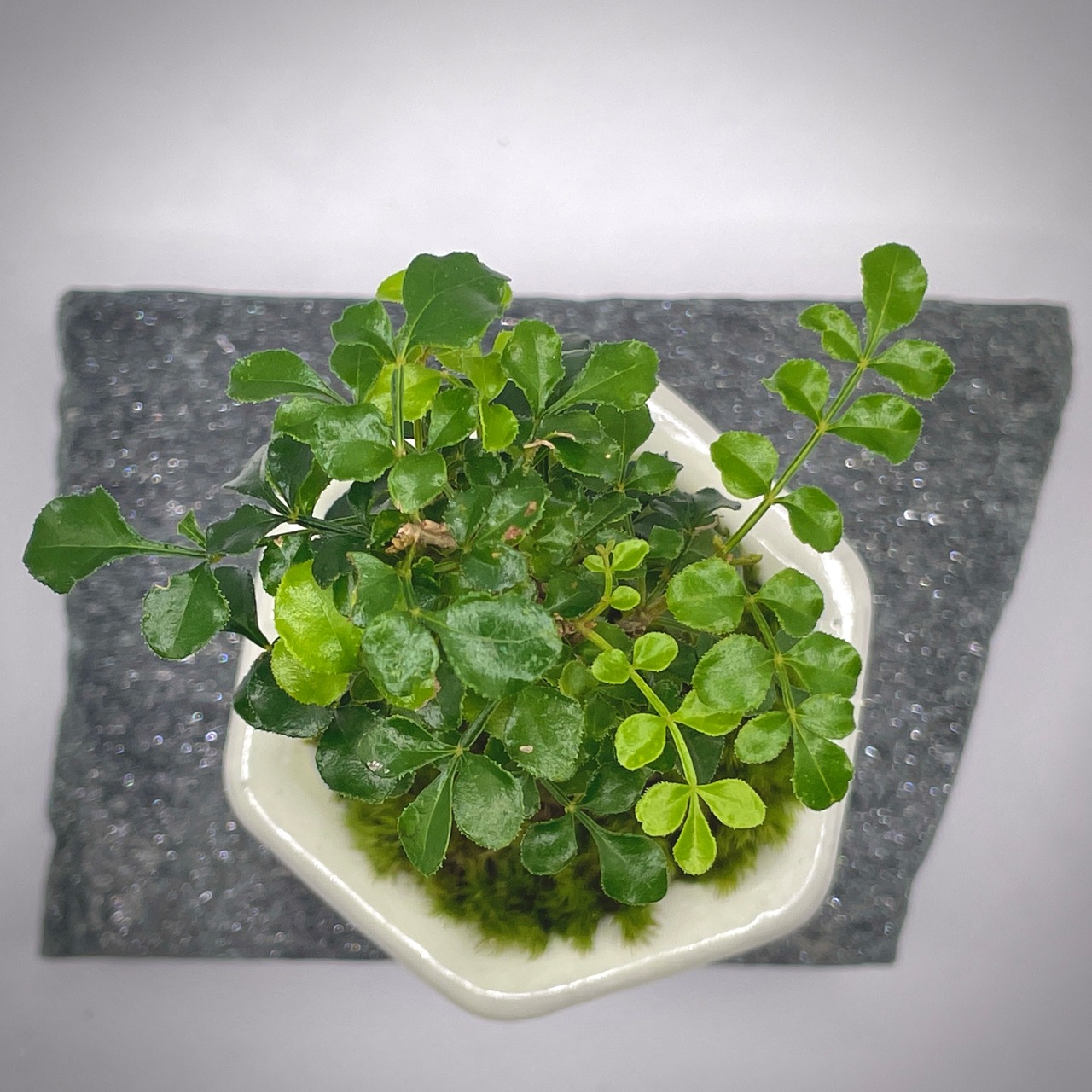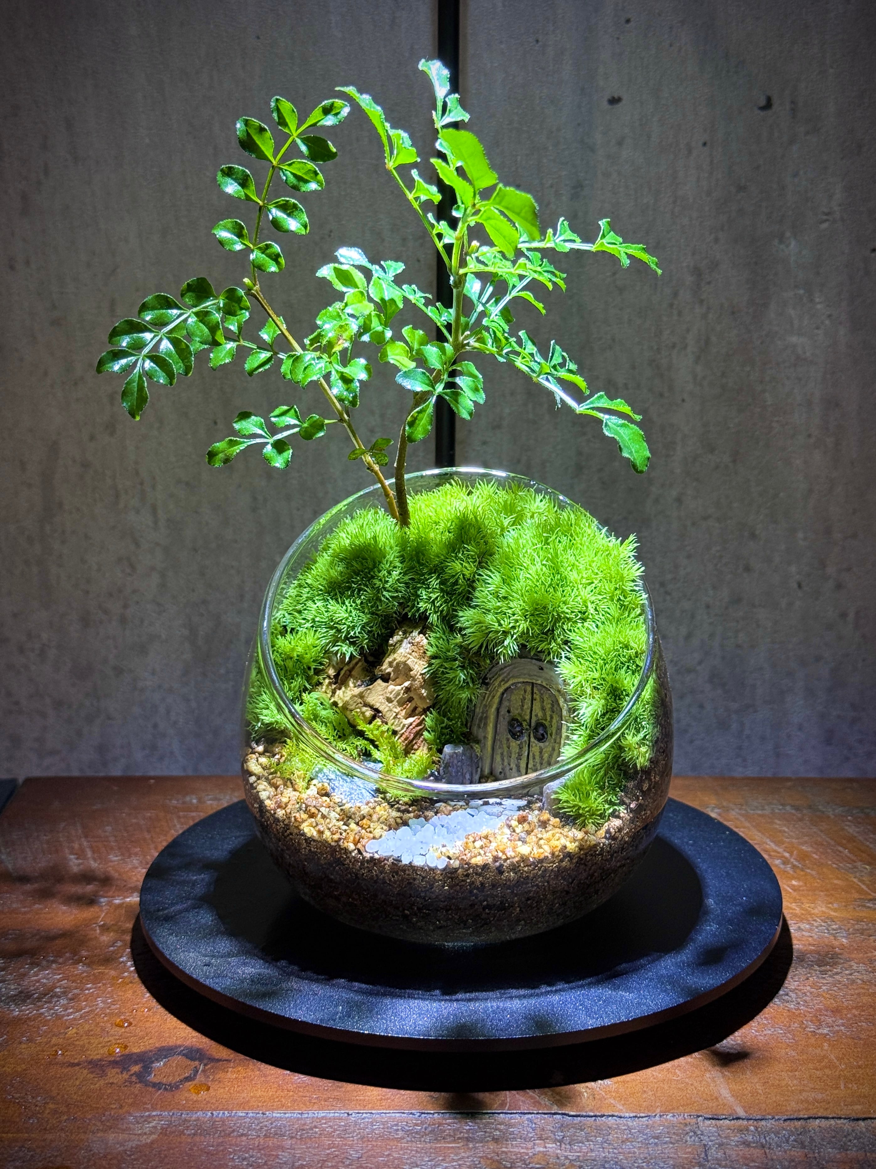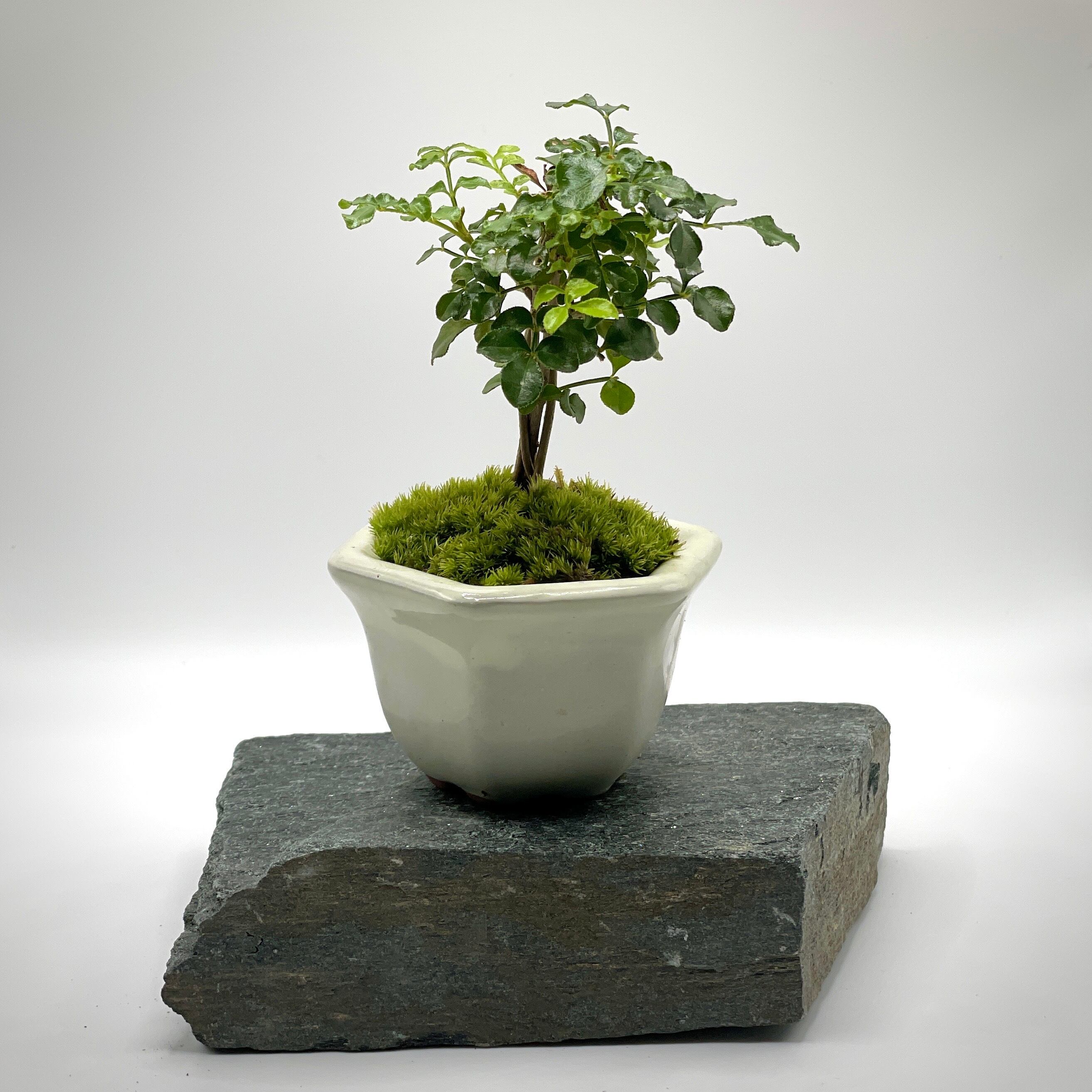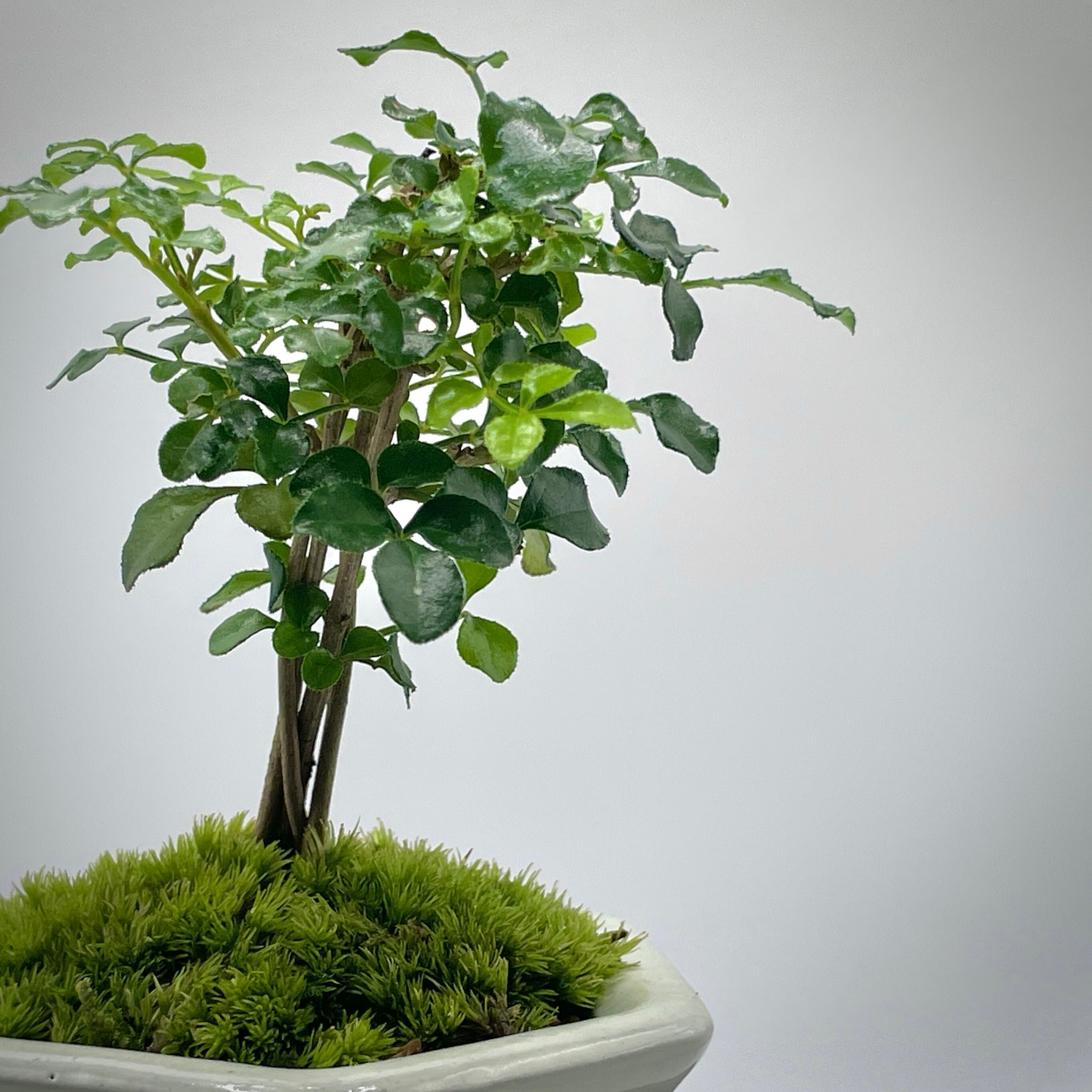 苗の頃から毎日新芽を摘み、実生2年生以上でありながら高さ約10センチ程度に押さえたシマトネリコ。オープン型苔テラリウムのアクセントにも。