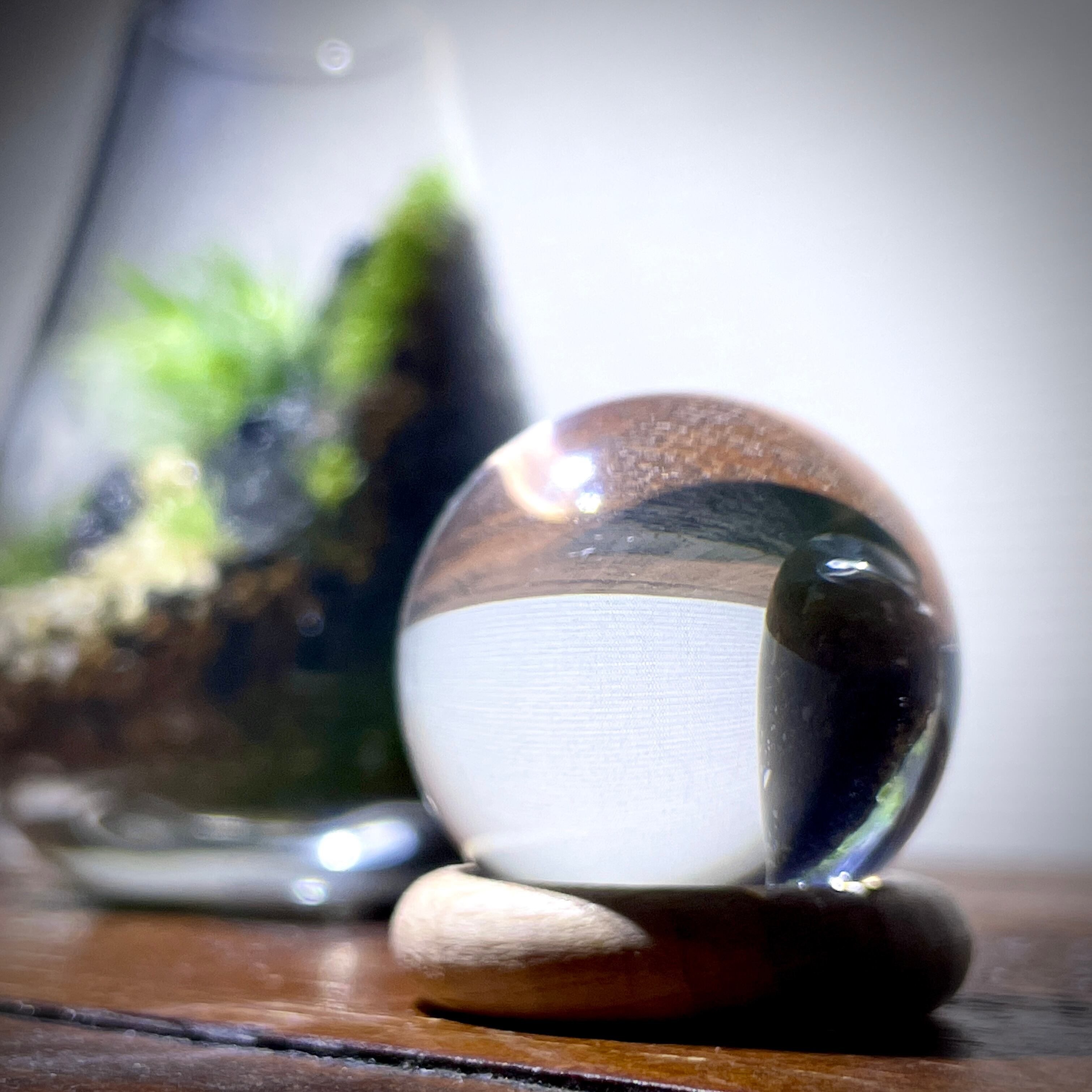 上部から灯りを照らすとアクリルボール内で光が集約し苔テラリウム内を照らしてくれます。